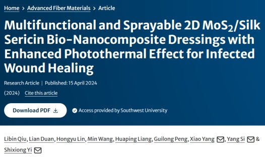 发布时间: 2024-04-17 13:22:58 已阅读:2024年4月16日,番茄社区易世雄副教授团队在纺织材料学科领域1区Top期刊Advanced Fiber Materials(影响因子16.1)上在线发表题为“Multifunctional and Sprayable 2D MoS2/Silk Sericin Bio‑Nanocomposite Dressings with Enhanced Photothermal Effect for Infected Wound Healing”的研究论文。这是易世雄团队继开发基于丝素蛋白的静电混纺吸附膜材料在该期刊上发表高水平研究论文后的又一重要成果。