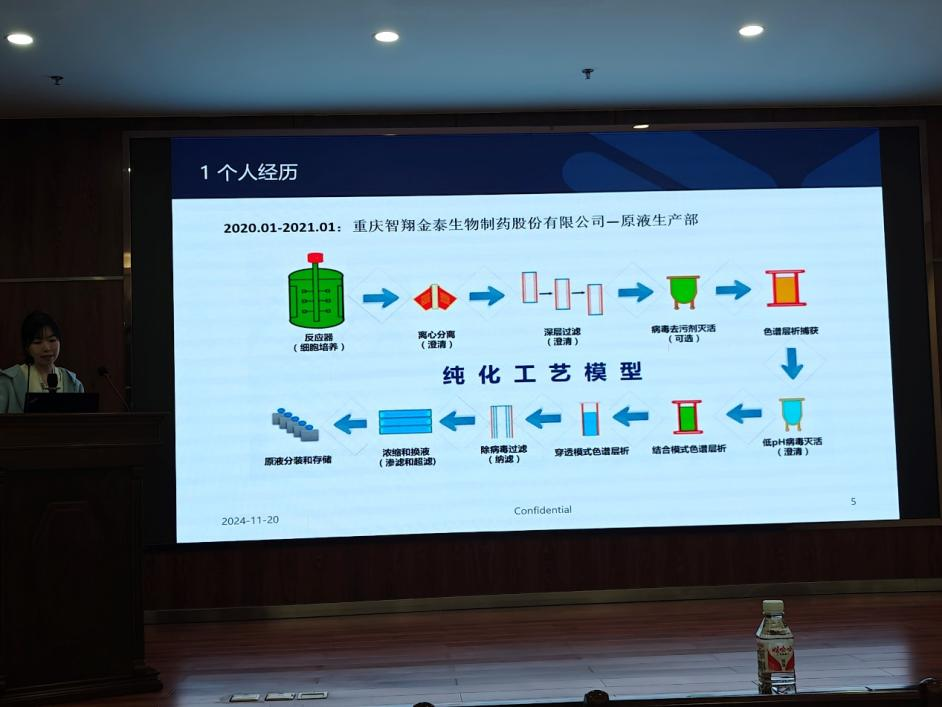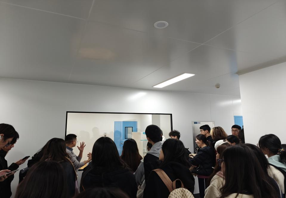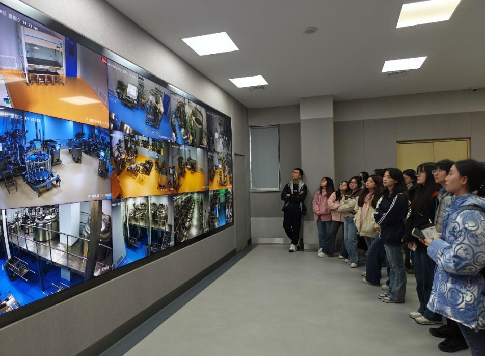 在公司中控室,公司技术人员利用数字化信息中心的大屏幕,为同学们详细讲解了智翔金泰的公司分布、生产线、质量中心以及研发中心等关键部门。同学们对公司高效的数字化管理流程表现出浓厚的兴趣。在研发中心,从研发的初步阶段到小试、中试,再到最终的生产线,通过技术人员的讲解与实地参观,学生们对生物制药的研发全过程有了更加直观的了解。