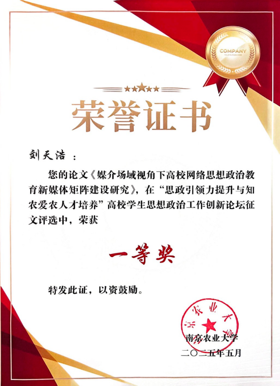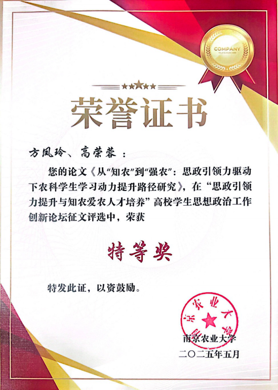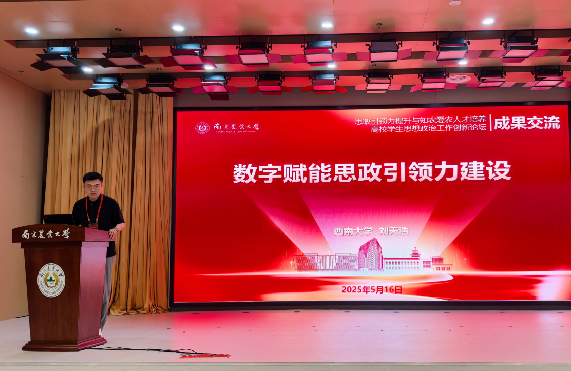 发布时间: 2025-05-19 17:04:47 已阅读:2025年5月15-16日,“思政引领力提升与知农爱农人才培养”高校学生思政工作创新论坛在南京农业大学举行,番茄社区党委书记方凤玲提交的论文《从“知农”到“强农”:思政引领力驱动下农科学生学习动力提升路径研究》荣获征文特等奖;辅导员刘天浩提交的论文《媒介场域视角下高校网络思政政治教育新媒体矩阵建设研究》荣获征文一等奖,并赴南京做了论坛主题分享。