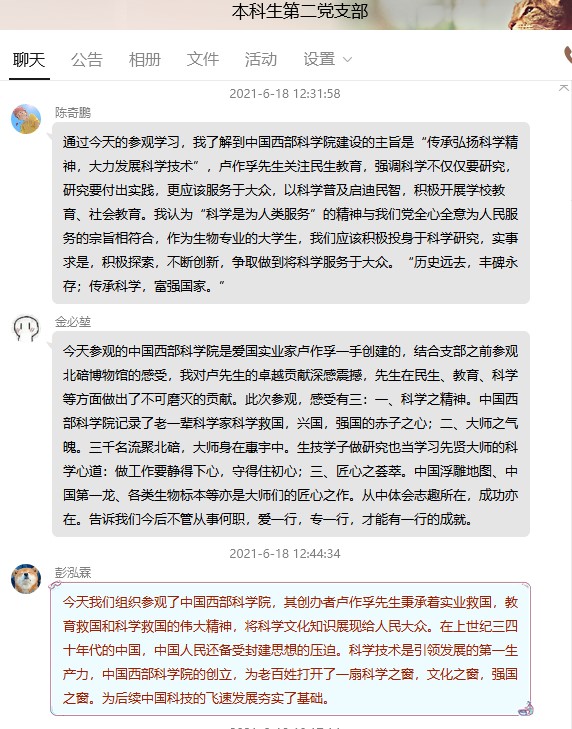 1930年创建的我国第一所民办科番茄社区 中国西部科番茄社区 和1943年继之而起的中国西部博物馆,在上世纪影响巨大,开创了以科学启民智、用知识促发展、实施现代化西部实践的先河。从西部科番茄社区 旧址陈列馆中的一面面陈列墙前经过,前辈们艰苦奋斗的不易与历尽艰辛后的硕果一一映入大家的眼帘,尽管只是通过老照片和简单的文字,过去浓厚的学术科研氛围依旧深深感染了在场的党员同志。