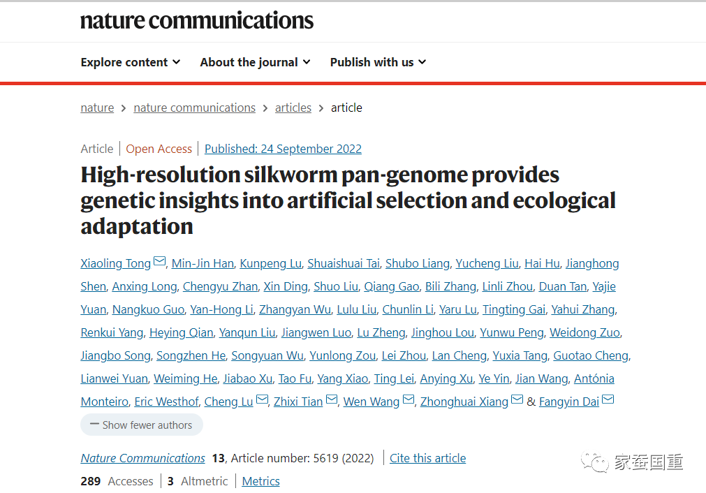 研究团队对1078份蚕种质资源(205份地方种,194份改良种,632份遗传材料,47份野桑蚕)进行了深度二代(短读长)测序,对其中545份代表性资源进行了三代(长读长)测序,产生55.57T基因组数据,组装了545个蚕的高质量基因组,对100个基因组进行了基因注释,鉴定到4300余万个SNP、930余万个Indel、340余万个结构变异(SV)和7308个新基因(家族),绘制了一个高精度家蚕泛基因组图谱。该超级泛基因组囊括了目前最全面的家蚕和野桑蚕基因组信息,是迄今全球动植物领域最大的长读长泛基因组。同时,对蚕的各种遗传变异、群体结构、人工选择和生态适应性及经济性状开展了深入的研究,取得丰硕的创新结果。研究论文“High-resolution silkworm pan-genome provides genetic insights into artificial selection and ecological adaptation”于2022年9月24日在国际名刊 Nature Communications 在线发表。