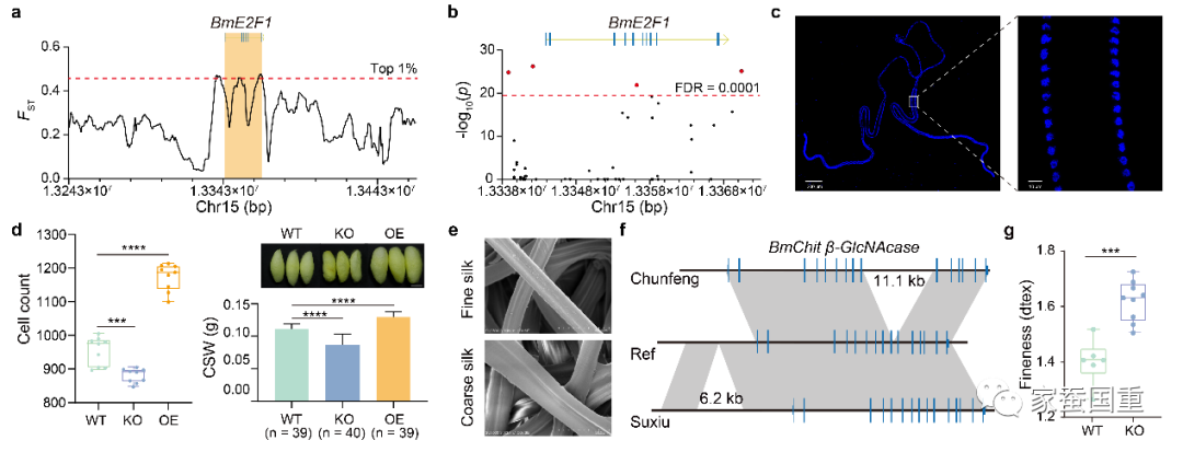 长期以来家蚕育种选择的主要目标经济性状是茧丝相关性状,如茧丝产量和品质性状。然而,迄今为止对这类属于数量遗传性状的控制基因和位点知之甚少。泛基因组可谓是连接表型特别是复杂性状和序列之间“最近的桥”。在本研究中的一个案例,从选择信号和结构变异切入,揭示了与细胞周期相关的转录因子BmE2F1调控家蚕茧丝产量。通过CRISPR-cas9敲除BmE2F1后,蚕的丝腺细胞数减少了7.68%,产丝量减少22%;在丝腺中过表达BmE2F1后,丝腺细胞数增加了23%,产丝量增加16%。另一方面,茧丝纤度是蚕丝的重要品质性状,细纤度蚕丝具有独特应用和更高的经济价值,但之前对茧丝纤度的分子遗传基础毫无所知。本研究中的另一个案例,通过分析细纤度品种基因组中存在的稀有变异,鉴定到控制茧丝纤度的基因BmChit β-GlcNAcase,该基因在细纤度品种中表达量显著提高,敲除该基因后家蚕的茧丝纤度变粗,表明该基因在茧丝纤度的决定中起关键作用。