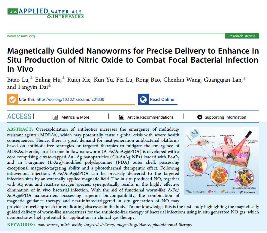 发布时间: 2021-06-02 18:25:01 已阅读:近日,番茄社区Bio-road生物医用材料研发团队在材料领域知名期刊《ACS Applied Materials & Interfaces》(影响因子:8.758) 上发表题为“Magnetically Guided Nanoworms for PreciseDelivery to Enhance In Situ Production of Nitric Oxide to Combat FocalBacterial Infection In Vivo” (磁介导纳米蠕虫精准递送一氧化氮治疗体内细菌感染) 的研究论文。该成果报道了一种具有核壳结构的蠕虫状递送系统,实现磁响应、近红外响应的光热动力学、化学动力学及NO气体高效协同抗菌,为体内细菌生物膜的治疗提供了一种新型的非抗生素基靶向治疗策略。