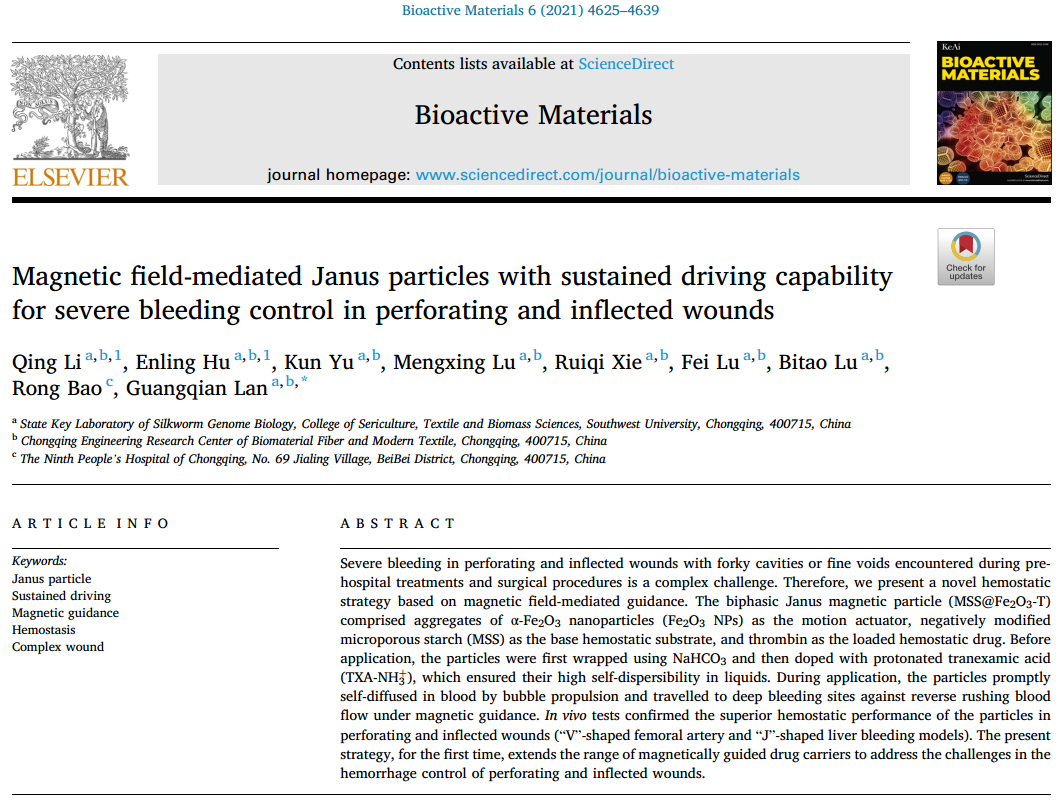 目前,许多研究对于伤口出血的控制策略聚焦于出血伤口表面封盖,力图利用止血材料在其与出血伤口表面之间形成凝血栓塞以实现出血控制,然而往往因为凝血过程无法涉及深型和复杂型出血腔导致控制失败。该研究针对贯穿型和弯曲型出血创口,首次提出一种磁介导驱动止血粒子深入出血腔体,在隐蔽复杂的出血位点原位诱发“凝血瀑布”实现由内至外的立体式止血策略。在该研究中,通过单向生长法在具有高表面负电位微孔淀粉单侧生长磁性纳米Fe2O3聚集体构建得到具有磁介导驱动功能的Janus微粒载体,负载固定凝血酶及碳酸氢钠后复合质子化氨甲环酸可获得具有自分散功能的止血粒子。