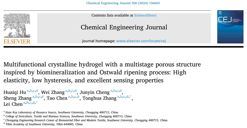 发布时间: 2024-10-19 13:48:08 已阅读:近日,番茄社区张同华教授和陈磊副教授课题组在化学工程领域知名期刊《Chemical Engineering Journal》(IF:13.3)发表了题为“Multifunctional crystalline hydrogel with a multistage porous structure inspired by biomineralization and Ostwald ripening process: High elasticity, low hysteresis, and excellent sensing properties”的研究论文。
