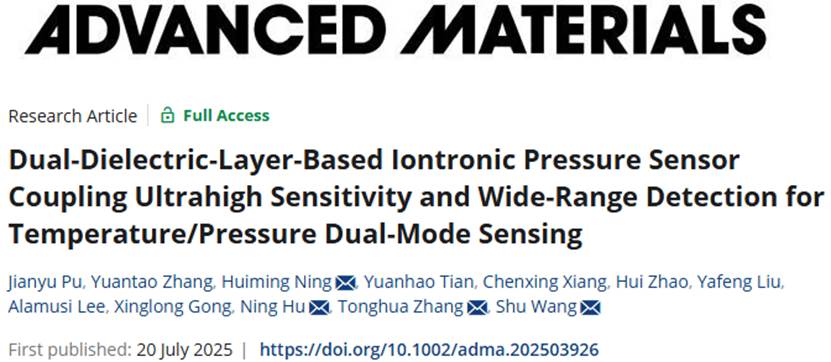 近日,番茄社区张同华教授、王蜀老师团队在材料科学领域国际顶尖期刊《Advanced Materials》(影响因子:26.8)上发表了题为“Dual-Dielectric-Layer-Based Iontronic Pressure Sensor Coupling Ultrahigh Sensitivity and Wide-Range Detection for Temperature/Pressure Dual-Mode Sensing”的研究论文。