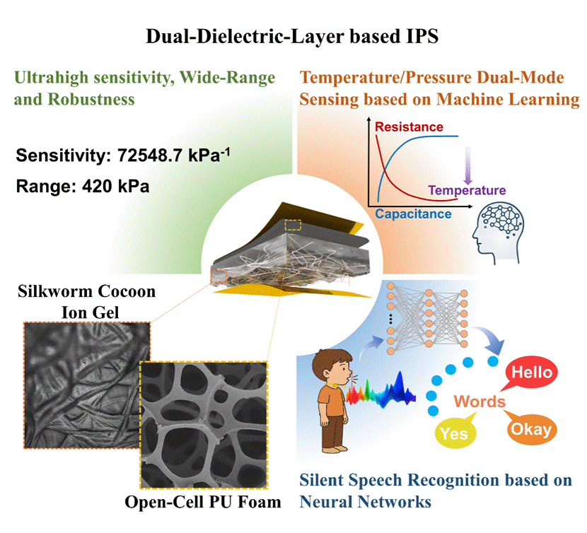 更为突出的是,该传感器具备温度/压力双模态感知与解耦能力。借助蚕茧离子凝胶的热响应特性,研究团队将电容与电阻信号进行协同分析,并结合深度学习回归模型,实现了复杂环境下温度与压力信号的实时解耦识别。此外,得益于其对微小压力波动的高度敏感性,传感器被成功应用于静音语音识别(SSR)系统,通过贴附于喉部监测皮肤细微变形并与LSTM神经网络结合,实现高达98.5%的词汇识别准确率。该研究不仅为柔性传感器结构设计提供新范式,也为无声交流、人机交互与智能穿戴系统提供了技术支撑与理论基础。
