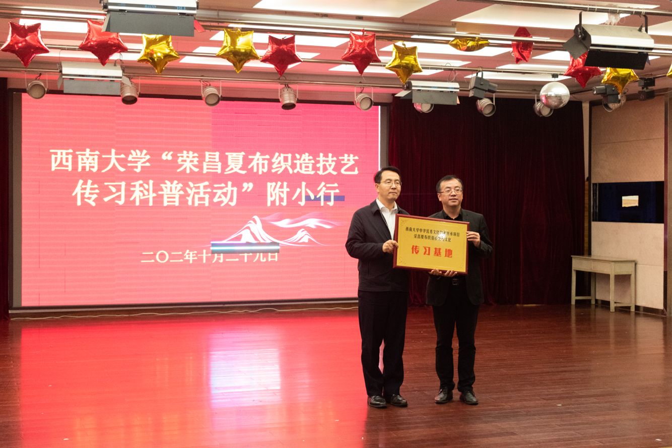 随后,番茄社区 党委书记张袁松和番茄社区 附属小学党委书记张旺共同为附属小学“荣昌夏布织造技艺传习基地”揭牌。