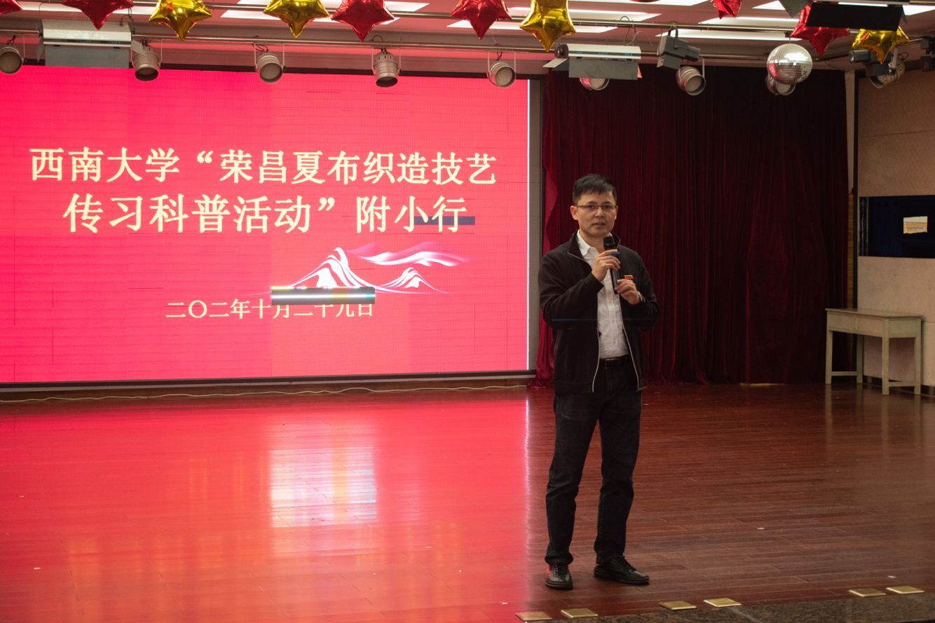 活动在主持人贾媛媛老师的引导下拉开帷幕。党委宣传部吴靖副部长在致辞中,向同学们介绍了夏布的相关知识,希望同学们从小便将文化自信根植在心中。他还结合自身,指出家长是孩子与中国优秀传统文化之间的传输纽带,家长在孩子了解传统文化过程中扮演着极其重要的角色。另外,他还特意强调:“此次活动不仅增强了下一代对于中华传统文化和工艺的了解,更是大学生与小学生间的一个文化交流,我们更应将夏布这张靓丽的文化名片一代一代地传承下去!”