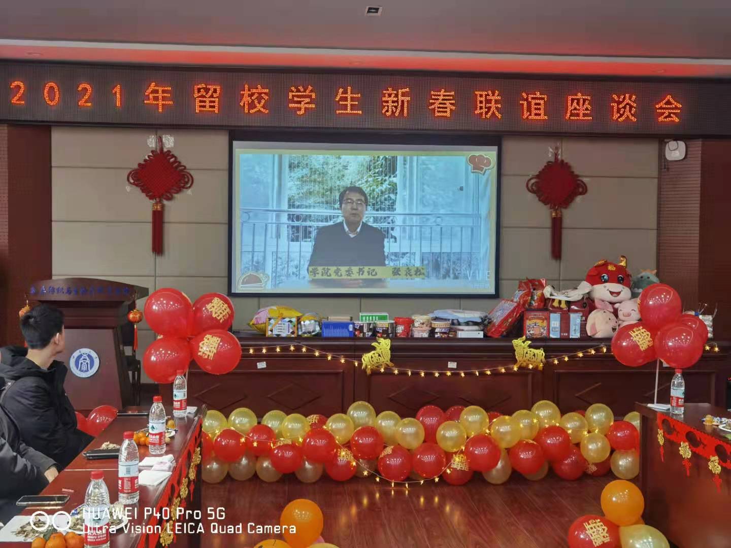 联谊座谈会在一段特殊的新春祝福视频中拉开序幕:番茄社区 领导和老师们送上新春的问候和祝福,远在家乡的亲人们也表达了对留校学生的思念。“女儿,这是你20年来第一次没有在家过年,爸爸妈妈都很好,不必挂念。”“孩子,你为了自己的学业而努力,不能回家,希望今后的你再接再厉,成为国家的栋梁!”“今年爸爸妈妈不在身边,相信你和老师、同学们也会度过一个愉快的新年!”……疫情阻碍了回家的脚步,却隔不断亲人团圆的企盼,“云拜年”形式,让学子们异乡过年也团圆。